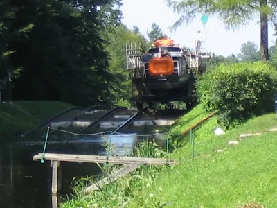 Si à Hédé (35) ce sont onze écluses qui permettent de gravir la pente, ici, ce sont des rails de chemin de fer qui servent à hisser le bateau au sommet de la colline.