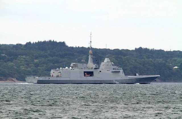 La frégate est en essai à Brest avec quelques passages sur les boucles magnétiques et des essais de détection...