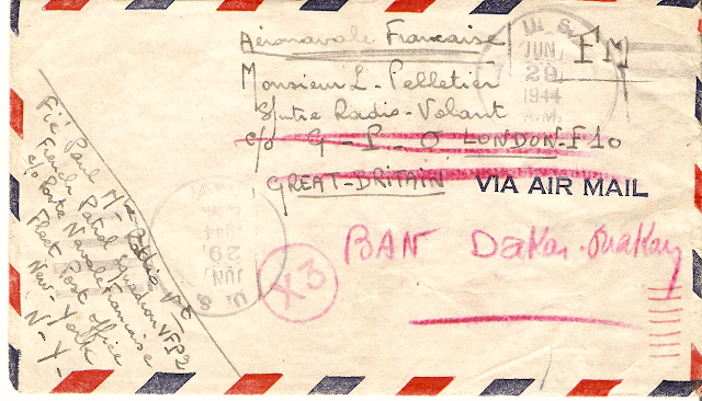 La lettre est adressée à "aéronavale française" SM Radio volant via G-P-O London F10.