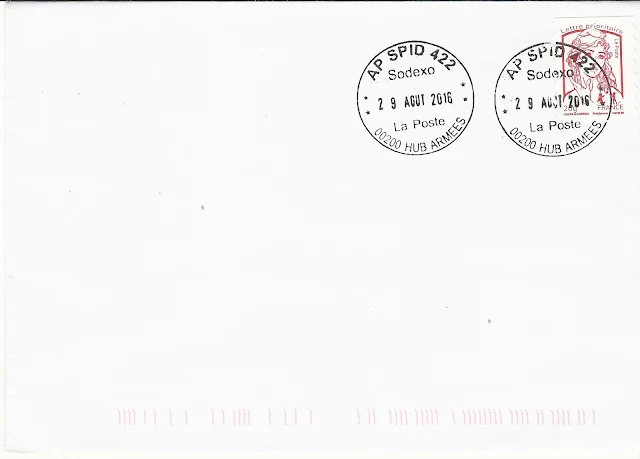 ce matin nouveau pli avec le timbre à date AP SPID 422 SODEXO 00200 HUB ARMEES. Ce pli provient des troupes françaises détachées au LIBAN. (le Code ISO du Liban étant 422)