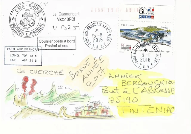 Alors que l'actualité met en avant le Marion Dufresne acteur du sauvetage de Kito de Pavant concurrent de la course autour du monde, les premiers plis de l'OP-3 arrivent dans les boîtes à lettres. Des signatures en perspective pour l'OP-4. Et peut-être un timbre pour 2017 par la philatélie des TAAF Merci d'avance Marc.Arrivée à Kerguelen, premier arrêt à 6 heures du matin le temps est superbe le soleil déjà haut dans le ciel, le spectacle est exceptionnel. Les premières rotations d’héliportage emportent le matériel dans la baie de la mouche, puis nous repartirons en direction de la baie du Morbihan et de Port-aux-Français, la base de Kerguelen.