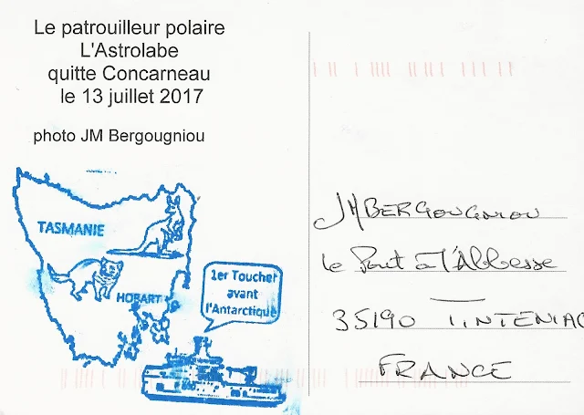 A l'occasion d'un échange de courriel hier, Jean Aufauvre m'a fait saliver et un peu m'inquiéter. Il avait reçu des plis de L'Astrolabe en provenance d'Hobart Tasmanie en timbres australiens et en timbres français. Moi, rien!
