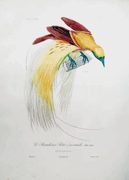 « Dès les premiers jours de notre arrivée à la Nouvelle-Guinée, cette terre de promission des naturalistes, nous aperçûmes les paradisiers-émeraudes volants dans ces vieilles forêts, filles du temps, dont la sombre profondeur est peut-être plus magique et le plus pompeux spectacle qui puisse frapper les regards d’un Européen. Ces volatiles frappaient l’air avec grâce et par ondulations : les plumes de leurs flancs formaient un panache gracieux et aérien qui, sans hyperbole, ne ressemblait pas mal à un brillant météore, filant dans l’air dans une étoile. »
