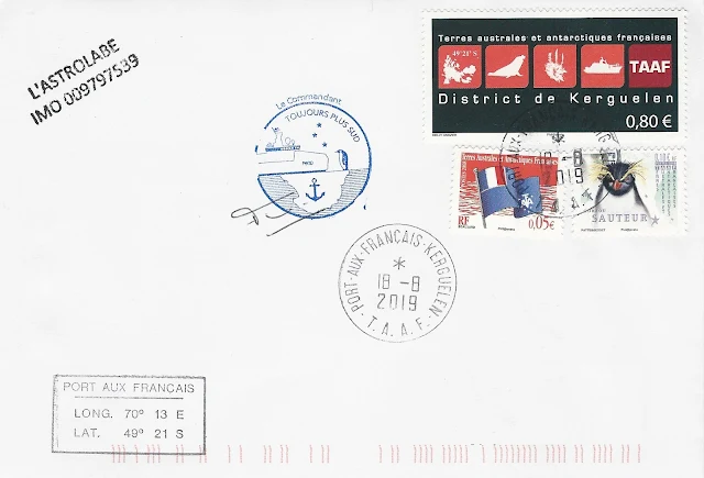 Par le timbre à date V 11260 SPID nous savons que l'Astrolabe a touché Kerguelen le 15 août 2019 et que les plis ont été oblitérés à Port-aux-français le 18-8-2019