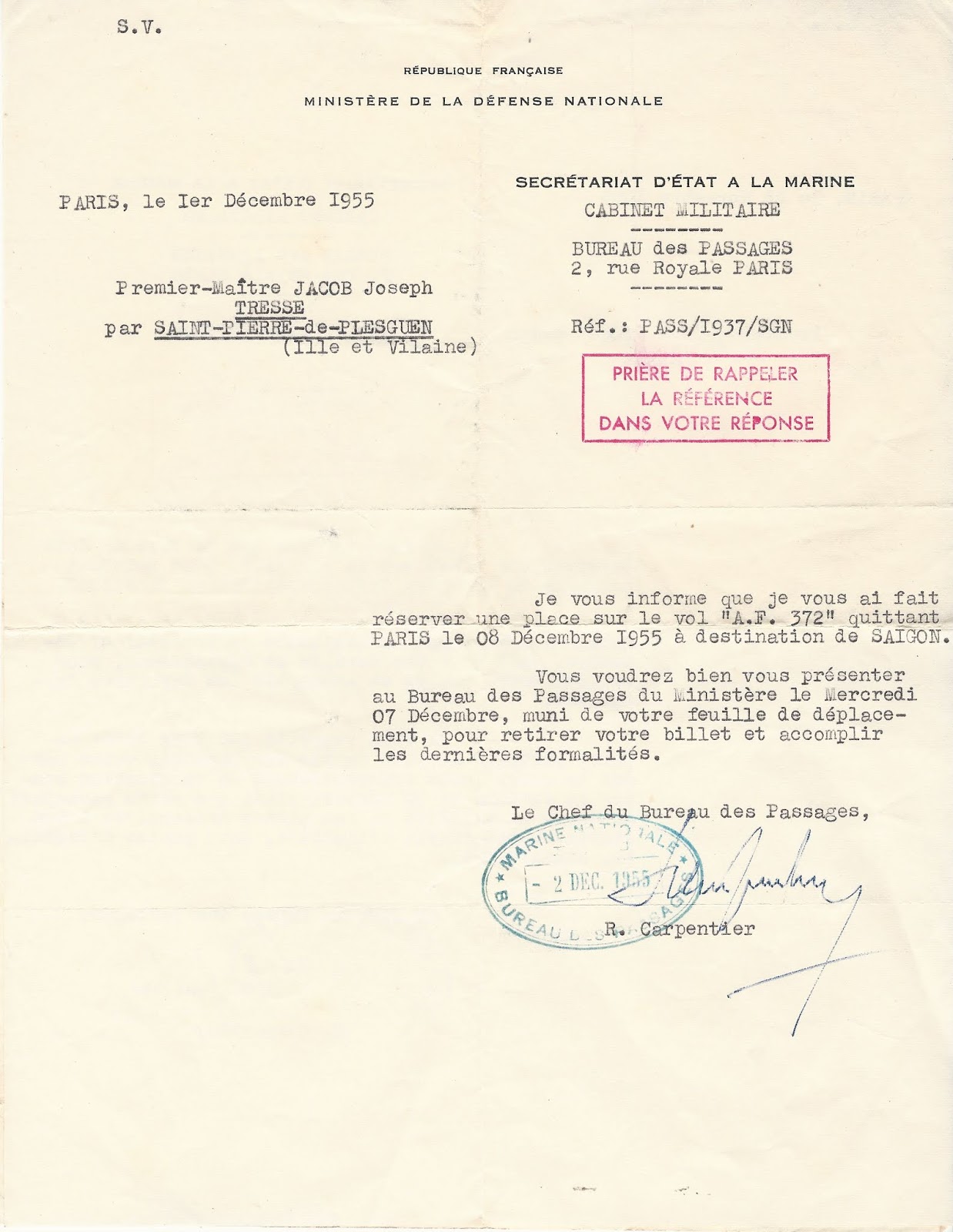 A l'automne 1955, le premier-maître Joseph Jacob est informé par le bureau des passages du secrétariat d'Etat à la Marine (OPEra 11-60) qu'il est désigné pour l'Indochine... Son départ est prévu par voie aérienne A.F.372 du 8 décembre 1955 à destination de Saïgon.Dans les papiers retrouvés dans une brocante se trouvait un sachet d'une pharmacie de Saïgon, la pharmacie SOLIRENE.