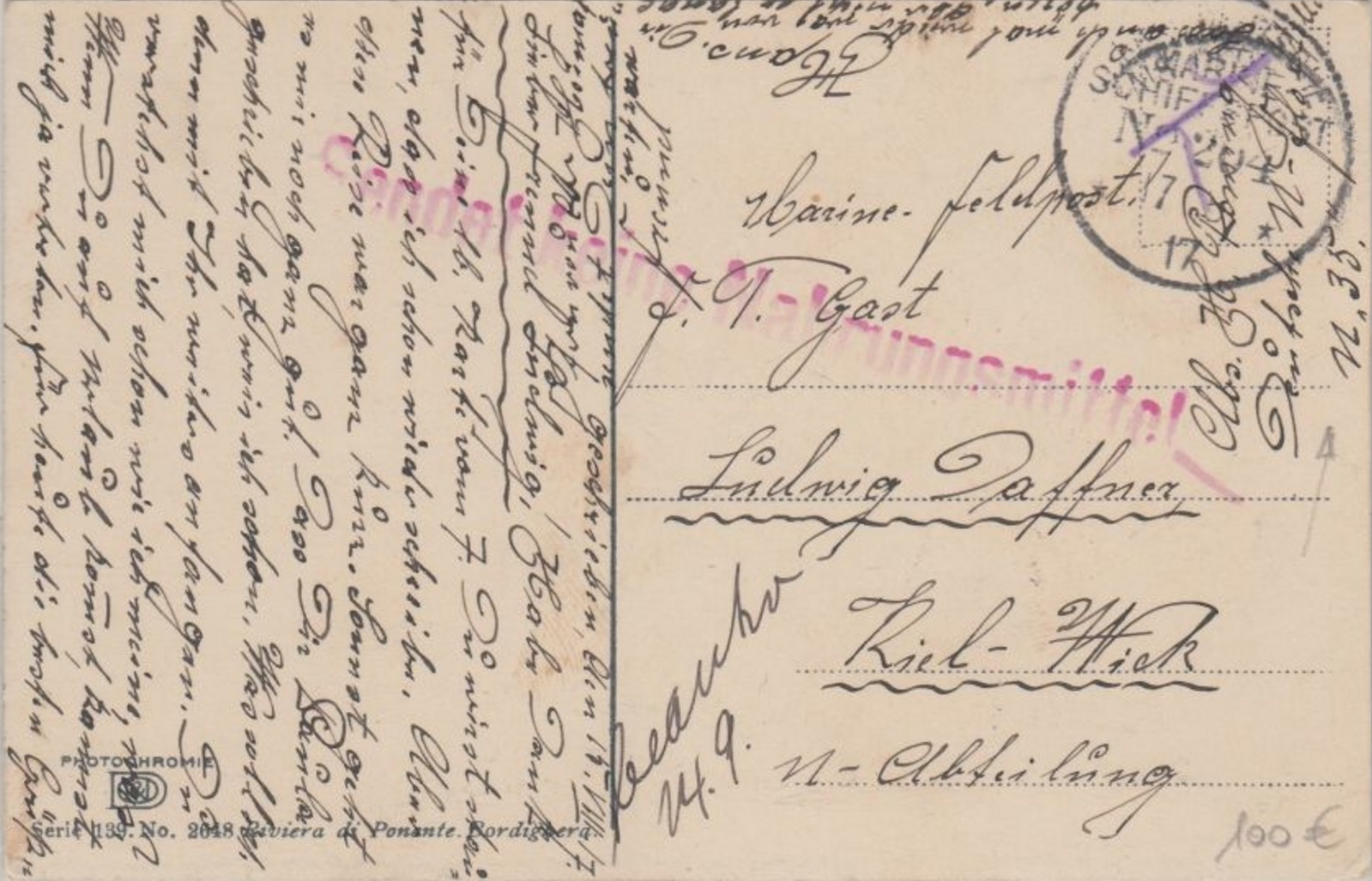 Marine feld Post n° 204 U-Boot 35 30-07-17 Griffe rouge "Ne pas envoyer d'aliments" |