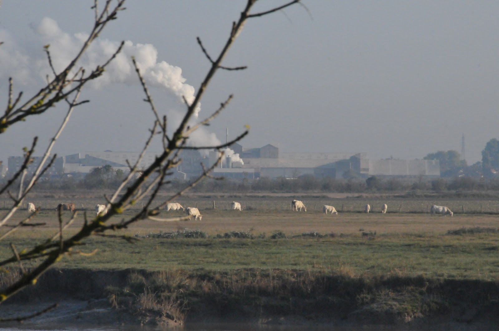 | Troupeau sous les volutes de vapeur d'eau de l'usine de séchage de grains |